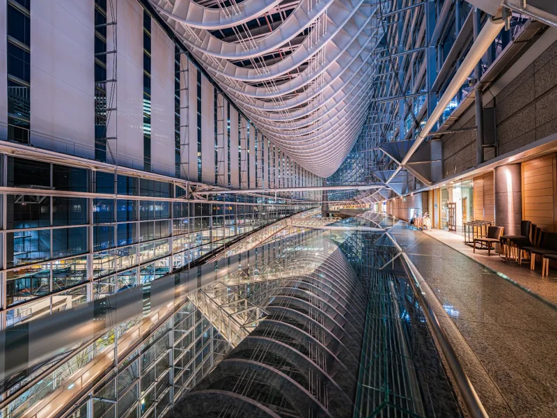 The Tokyo International Forum, located between Tokyo Station and Yurakucho Station in Chiyoda City, is one of the capital’s most iconic examples of contemporary architecture—and a magnet for architectural and urban photographers. Designed by renowned architect Rafael Viñoly and completed in 1996, the complex is best known for its breathtaking glass atrium, shaped like a futuristic ship suspended in space. The atrium’s soaring steel framework, expansive glass walls, and side apertures create a constantly shifting interplay of light and geometry, making it a prime spot for dramatic perspective shots and minimalist compositions. For those capturing Tokyo’s urban landscape, the Forum offers an abundance of angles—especially from the upper floors, where the atrium’s full scale and rhythm of repetition are most apparent.