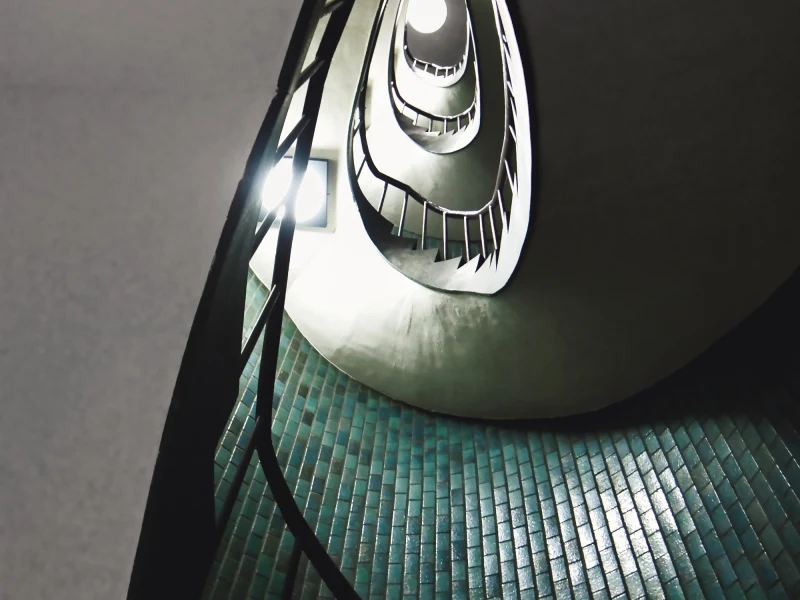 From above, the staircase resembles a vortex of clean lines and curved shadows, while from below, it spirals upward like a sculptural ribbon of light and form. The symmetry is especially compelling when captured with a wide-angle lens from mid-level floors, where the full depth and elegance of its geometry can be appreciated. Minimal distractions and controlled lighting conditions make it an ideal space for architectural composition, symmetry studies, and vertical framing.