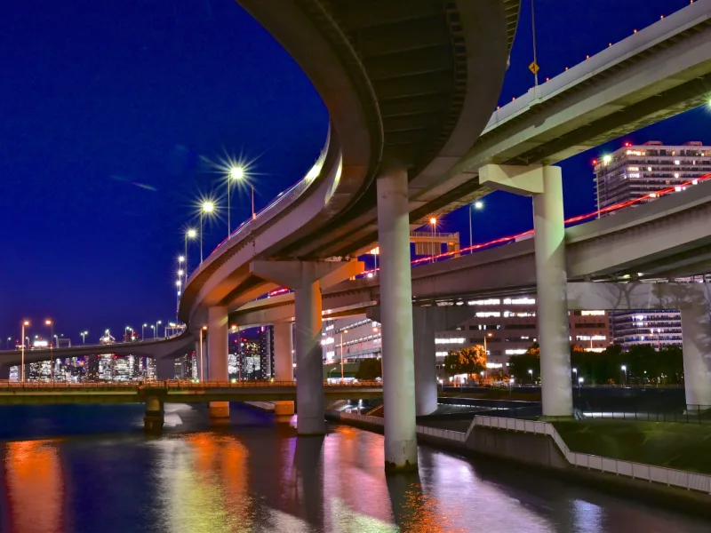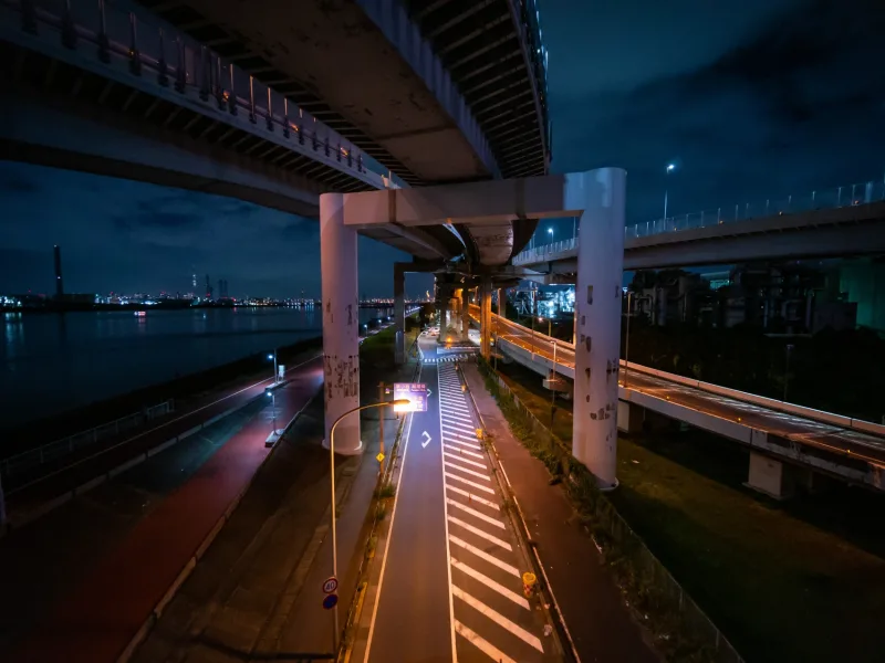 At the meeting point of the Bayshore Route and Central Circular Route in Edogawa ward, Kasai Junction reveals an intricate world of elevated roads and city light. Multiple tiers of expressway twist and overlap like a sculptural installation, with concrete beams cutting through the sky at dramatic angles. Beneath these structures, golden highway lights flicker against tall pillars, while a nearby sewage treatment facility casts a warm, ambient glow across the scene.