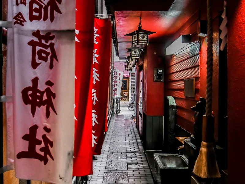 The shrine is dedicated to a deity associated with food, harmonious relationships, and fire safety, and its long-standing reputation for blessings in love and business continues to draw faithful visitors. Small details enrich the atmosphere: offerings of abura-age [油揚げ]—deep-fried tofu believed to please the fox messengers of Inari—sit beside weathered stone lanterns and a humble offering box. Despite the surrounding modern architecture, the space feels timeless. For photographers, the dim lighting and tight composition present a welcome challenge, especially in capturing the delicate balance between shadow and tradition.