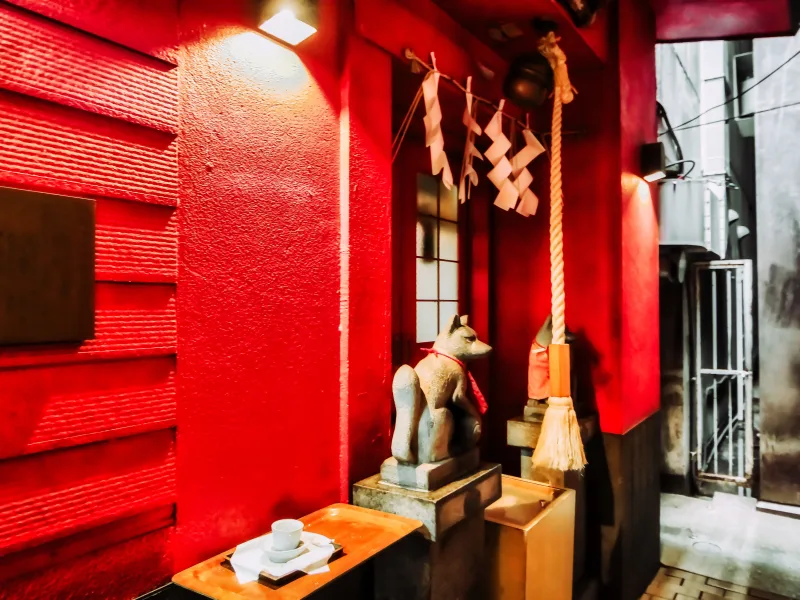 Tucked away in a quiet alley just steps from one of Tokyo’s busiest shopping streets, this intimate Shinto shrine offers a striking contrast to the energy that surrounds it. Though modest in size, it holds deep cultural resonance, particularly among those in the performing arts, who visit to pray for protection and professional success. The approach is subtle—visitors pass a discreet stone marker and follow a narrow, shaded path that opens into a compact yet serene courtyard. Here, vermilion walls, fox statues, and sacred ropes [shimenawa, 注連縄] set the stage for quiet contemplation.
